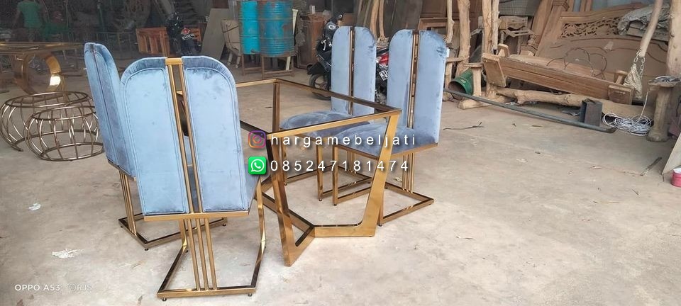 Kursi dan Meja Makan sekarang ini merupakan bagian penting dari interior rumah, bukan hanya digunakan sebagai tempat penyajian dan menyantap makanan, Set Kursi Makan juga dijual menurut nilai estetika keindahannya dalam interior ruangan. “Harga Mebel jati (HMJ)” furniture memperkenalkan design baru yaitu Set Kursi Makan Minimalis Mewah dan Modern Industrial Stainless Steel dengan dudukan dan sandaran jok yang dipadukan dengan meja berbahan stainlees steel kuat dan anti karat serta bentuknya yang artistik yang dipadukan meja kaca bahkan marmer atau batu alam yang memberi kesan elegan dan mewah secara bersamaaan. Bahan baku yang digunakan merupakan Stainless steel berkualitas yang dipoles dengan warna gold atau rose gold yang memberi kesan mewah saat digunakan dan diletakkan di salah satu tempat dalam rumah.